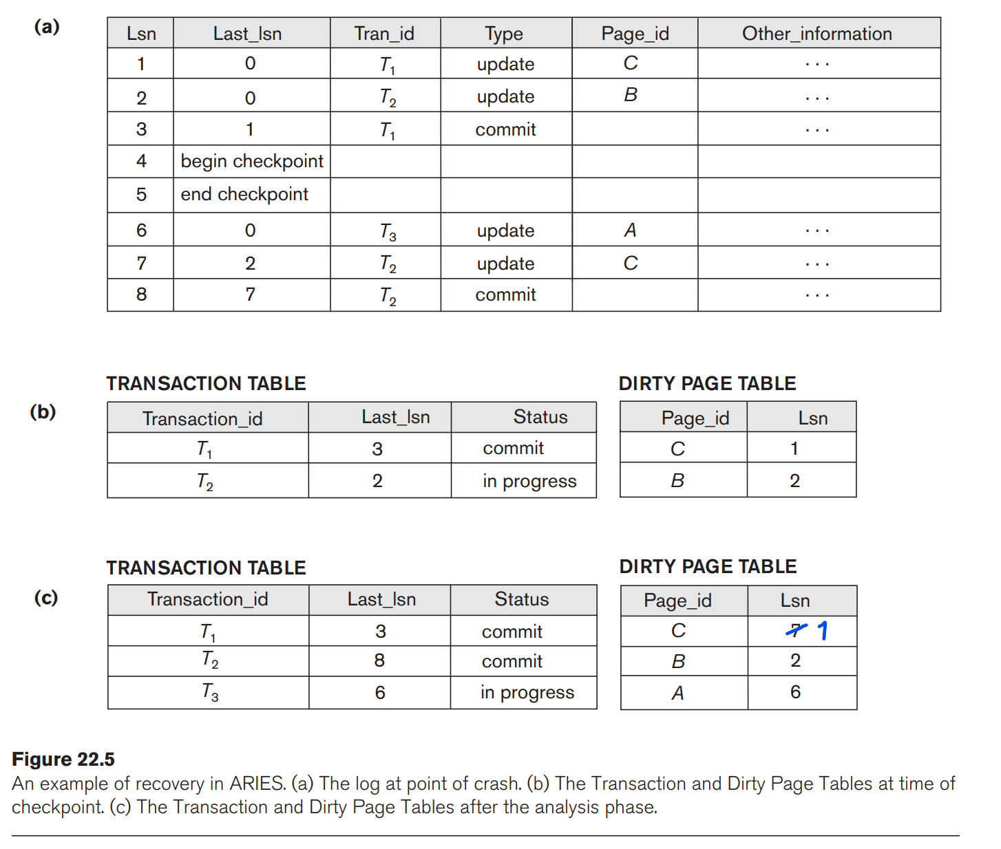 During analysis, the log records being analyzed may cause modifications to these two tables. For instance, if an end log record was encountered for a transaction T in the Transaction Table, then the entry for T is deleted from that table. If some other type of log record is encountered for a transaction T′, then an entry for T′ is inserted into the Transaction Table, if not already present, and the last LSN field is modified.
