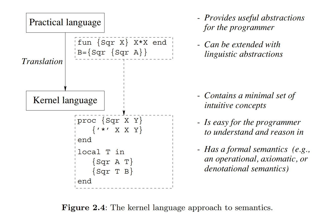 In the kernel language approach, a practical language is translated into a kernel language that consists of a small number of programmer-significant elements. The rich set of abstractions and syntax is encoded in the kernel language, giving insight into what the language does. Simple formal semantics allow reasoning about program correctness and complexity. This is a language-independent way to study programming.