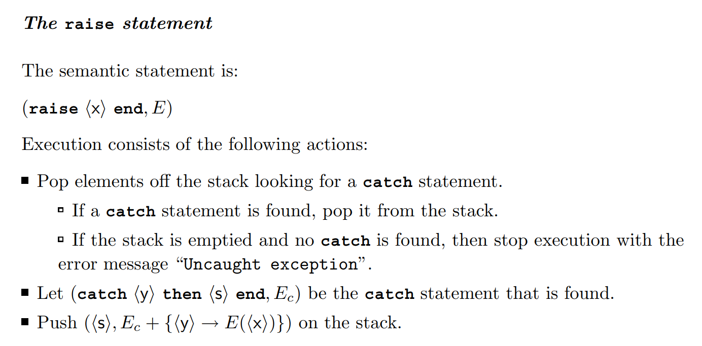 A program is simply a statement . The initial execution state is At each step, the first element of is popped and execution proceeds according to the form of the element. A semantic stack can be in one of three run-time states: runnable (can do a computation step), terminated (empty), or suspended (not empty, but it cannot do any computation step).