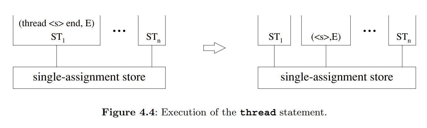 . A thread is simply an executing statement, i.e., a semantic stack. This is all we need to start programming with declarative concurrency. - The second step extends the model with another execution order. We add by-need triggers and the single instruction