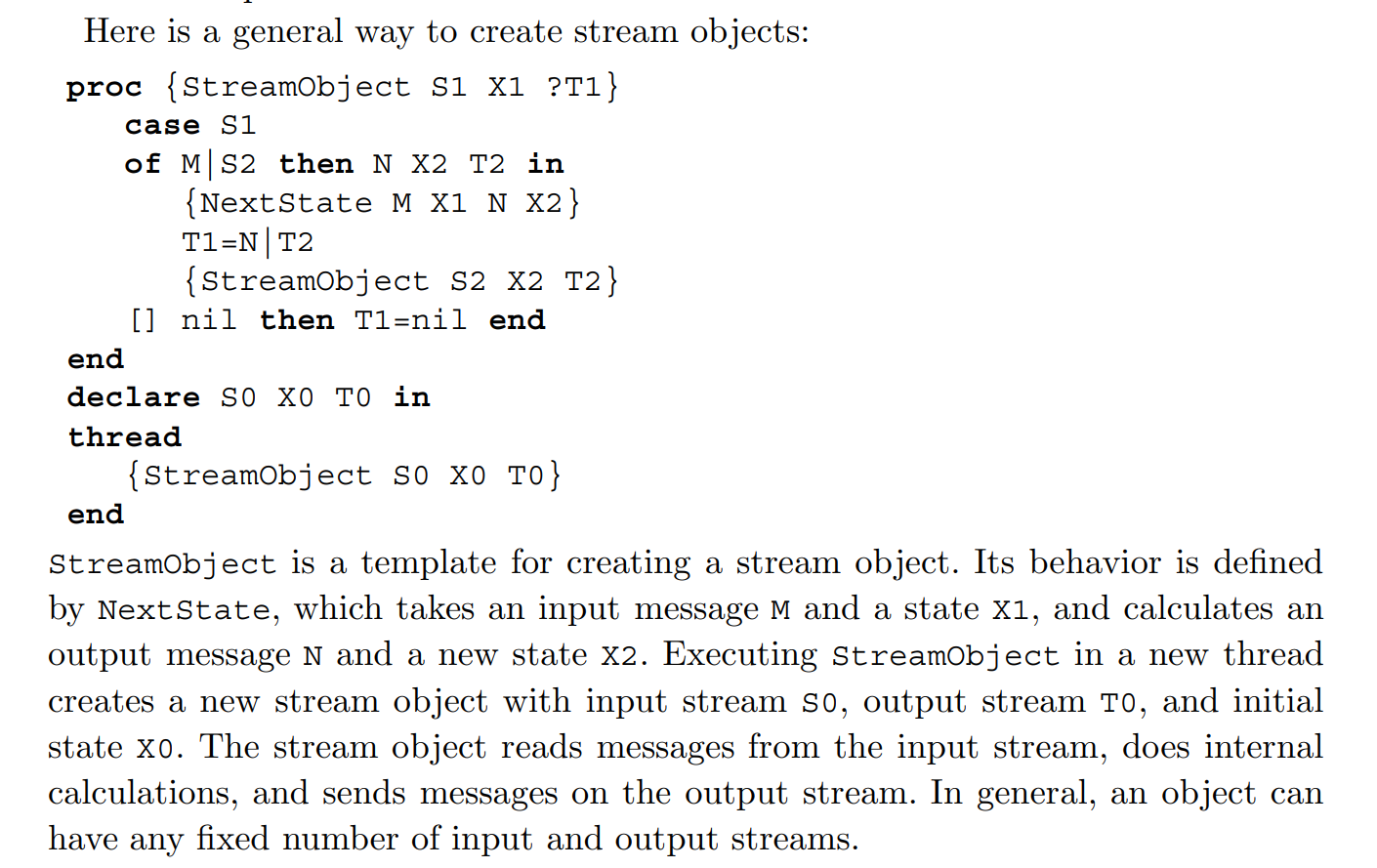 The most useful technique for concurrent programming in the declarative concurrent model is using streams to communicate between threads. A stream is a potentially unbounded list of messages, i.e., it is a list whose tail is an unbound dataflow variable. Sending a message is done by extending the stream by one element.