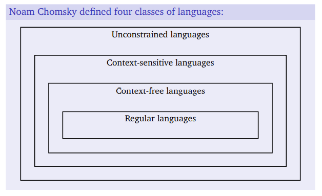 - Different grammars have different computational complexity: unrestricted context-sensitive context-free regular