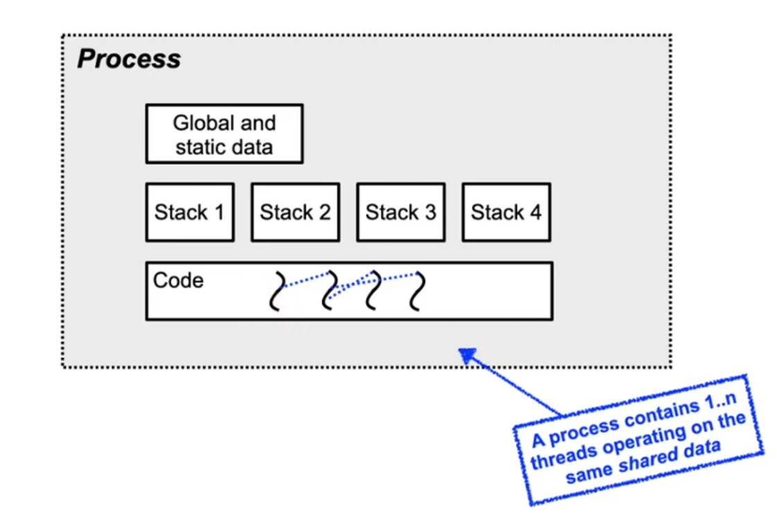 - Every thread has its own stack and CPU register set (escpecially the program counter)