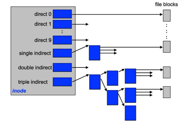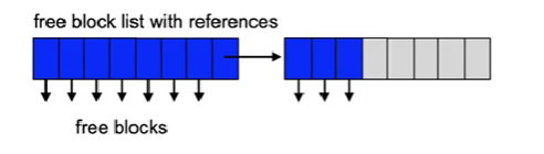 - Optimization: one free block contains many block numbers of additional free blocks and possibly also the block number of an additional block containing the numbers of free blocks