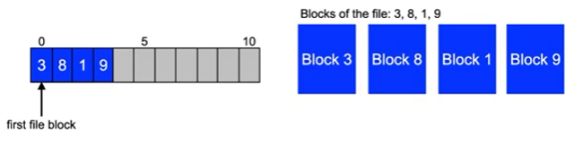- requires to store information about the first block and the number of subsequent blocks, e.g. Start: block 2, length: 3