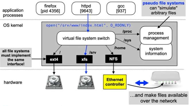 - more precisely: every resource in the system can be accessed using a name mapped into a directory hierarchy