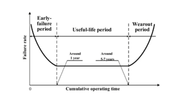 The "bath tub curve" shows the typical development of the error rate of hard disks (and most other technical products) over their lifetime
