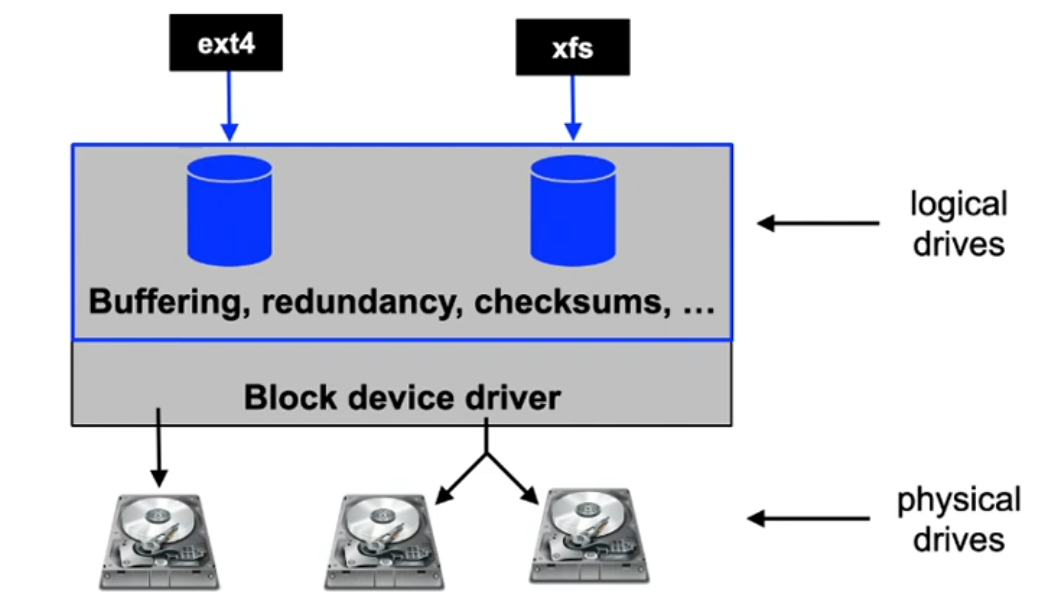 - possible to make use of knowledge about the file system structure, e.g. different RAID levels for data and metadata