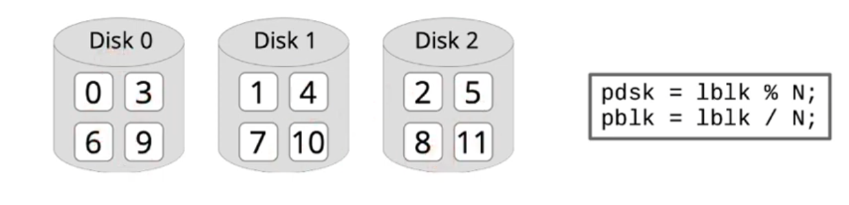 - Idea: Data of a large logical disk are stored in a round robin way distributed over N physical disks: