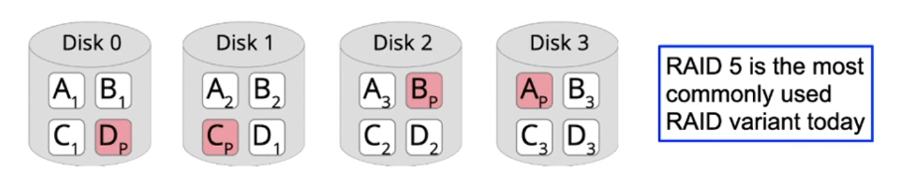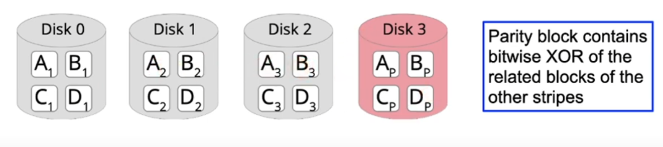- Disadvantage: parity disk is bottleneck when writing