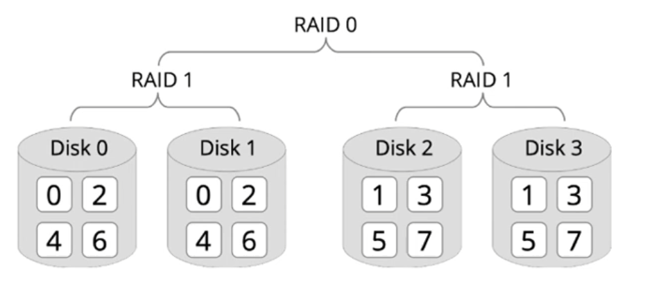 - Idea: Combine different RAID mechanisms in a hierarchy, e.g. RAID 1+0 (= RAID 10):