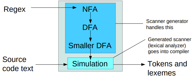 To summarize, the McNaughton-Thompson-Yamada algorithm translates a regular expression to an NFA. Subset Construction translates an NFA to a DFA. Systematic minimization optimizes a DFA, resulting in one with minimal number of states. This is performed in problem set 1 of the course.