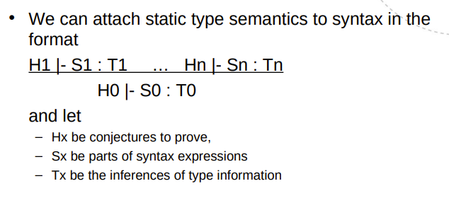 - Operational semantics, which describe the meaning of a statement in terms of what you do to the environment in order to create its effect