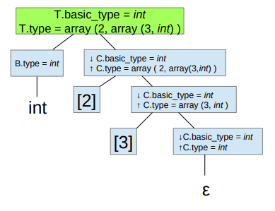 Semantic actions can be attached to grammar productions, and executed while parsing. They may for example derive or synthesize symbol attributes. In a syntax tree representation, inherited attributes come from above, synthesized attributes come from below. L-attributed grammars allow synthesized attributes, and inheritance from the left. Top-down grammars support L-attribution. In S-attribution, all attributes are synthesized. Bottom-up grammars support S-attribution.
