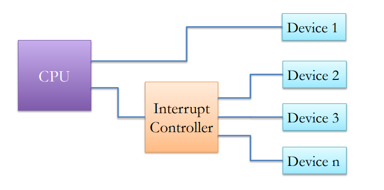 - CPU: Saves state (PC, other registers) and jumps the interrupt handler