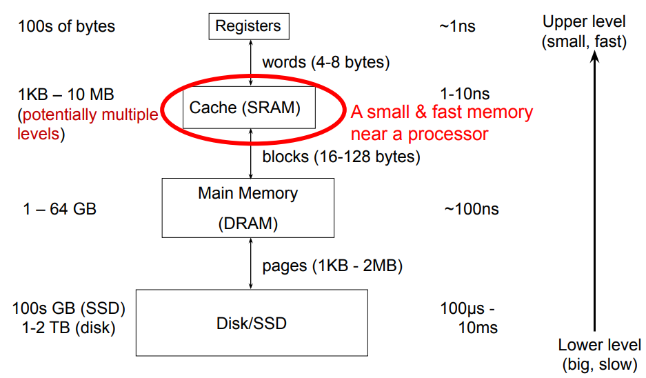 - Small, fast cache next to a processor backed up by larger & slower cache(s) and main memory give the impression of a single, large, fast memory