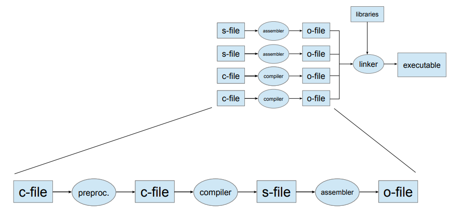 - A linker combines these into an executable, resolving references between units