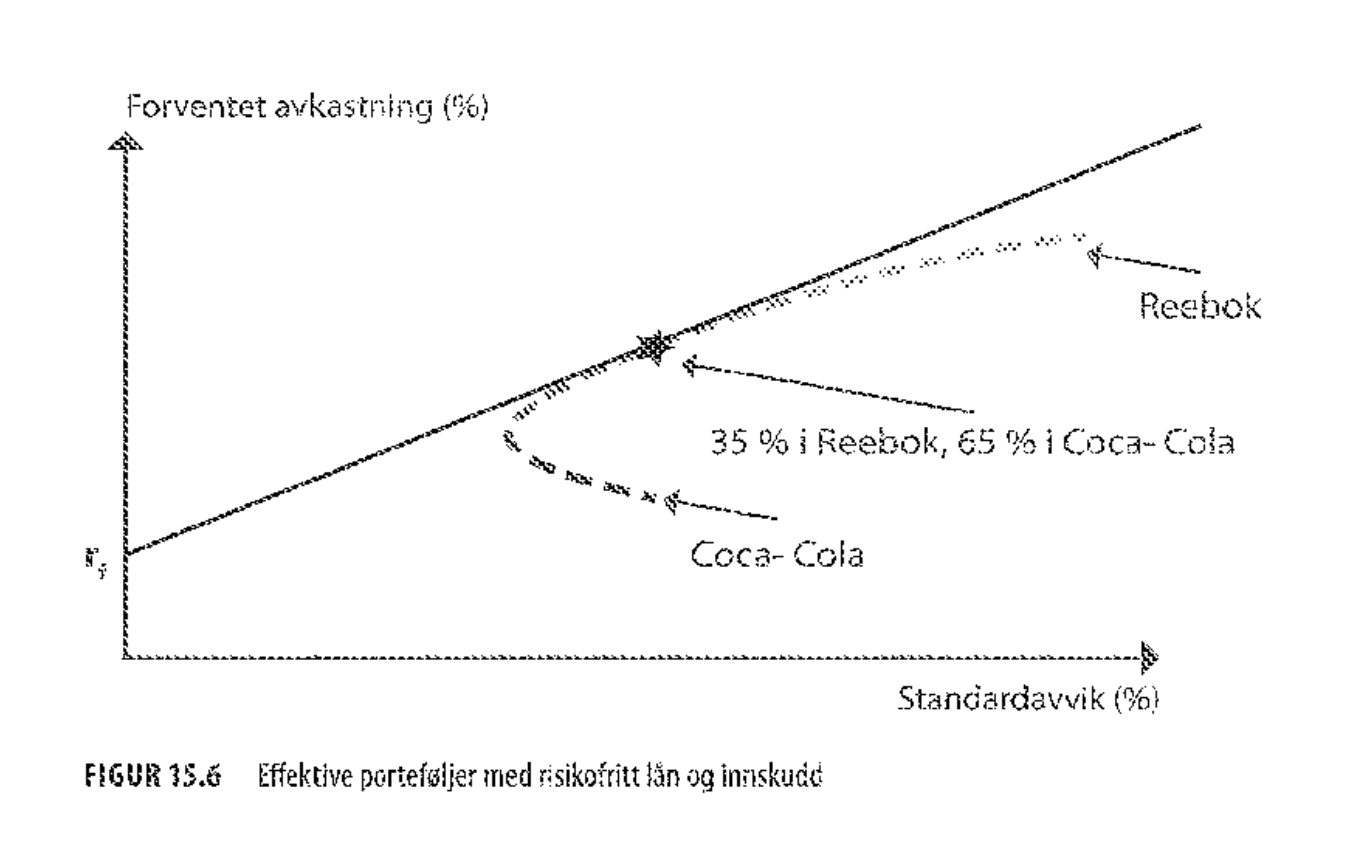 Linjen som går fra risikofri rente og tangerer kurven representerer effektive porteføljer og kalles kapitalmarkedslinjen.