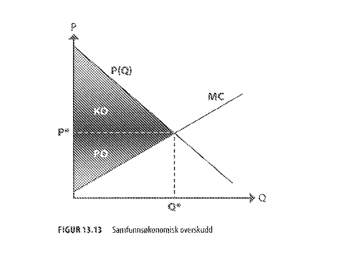 Samfunnsøkonomisk overskudd er summen av konsumentoverskudd og produsentoverskudd. Dette er størst når , altså under frikonkurranse.